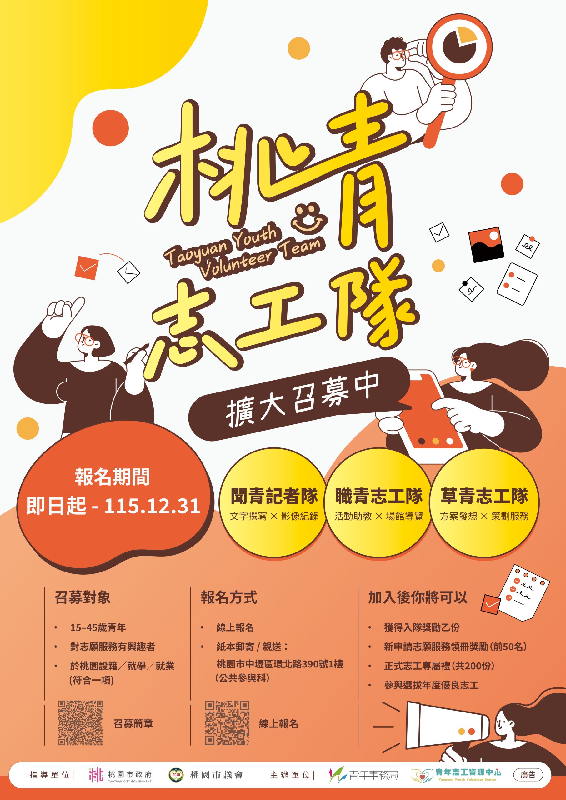 (一)招募對象:15歲至45歲,設籍、就學或就業於桃園市,對志願服務有興趣之青年。