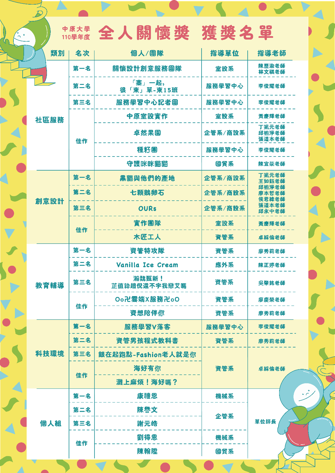 110學年度 2022-06-01 中原大學全人關懷獎 / 榮譽榜 You Might Also Like 113學年度 2025-08-18 112學年度 2024-06-27 111學年度 2023-08-01